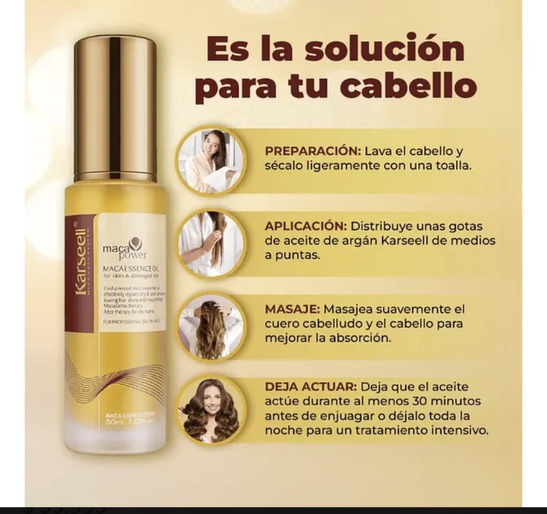 Transforma tu cabello en solo minutos con Karseell Maca Power Collagen. Diseñado para nutrir, fortalecer y revitalizar desde la raíz hasta las puntas, esta poderosa fórmula combina los beneficios de la Maca Peruana y el Colágeno Hidrolizado, dos ingredientes estrella que aportan resistencia, brillo y una hidratación profunda.